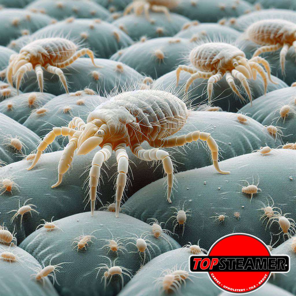 Dust Mites are microscopic insects in the arachnid family that includes spiders, scorpions and ticks. They live their whole lives in mattresses, pillows, and in dark corner dust bunnies: hatching, growing, eating, defecating, mating, laying eggs.
